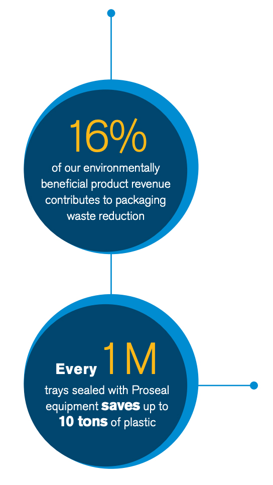 To help our customers reduce overall plastic usage, our Proseal® technologies replace more cumbersome and wasteful alternatives. Compared to using a plastic clamshell, the top-sealed trays run through Proseal equipment use 42% less plastic and makes stacking packages much more efficient. This saves on space and hassle in transportation and storage. Horizontal film wrapping of containers uses less plastic than clamshells but comes with its own challenges.