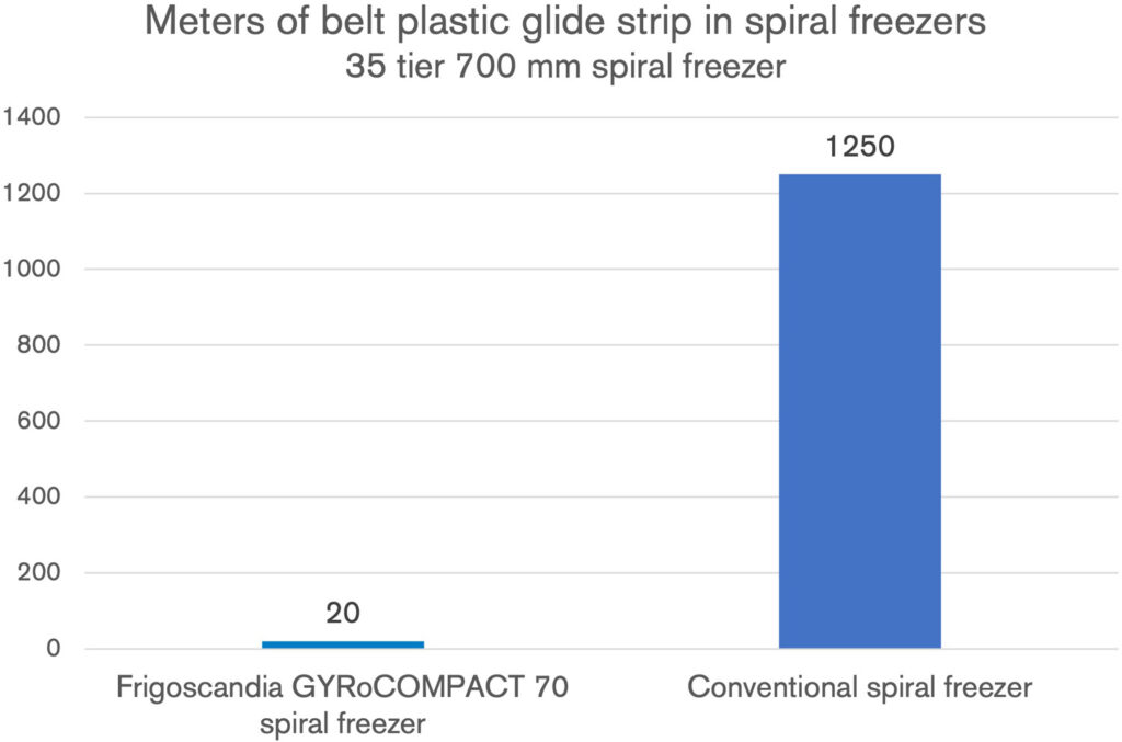 Conventional spiral freezers, for example, are based on plastic wear strips to achieve acceptable friction. When the belt moves alongside the drum on plastic-coated guides, the friction wears on the plastic and releases small microscopical parts. These wear strips has a typical acceptable wear of 1-2 mm over 20,000-30,000 hours of operation. A conventional 35 tier 700 mm wide belt spiral freezer has a total length of 1,250 m belt wear strips in tier carriers. The total area with 14 mm wear surface is 18 dm2. That gives a total volume of worn off plastic (1.5 mm wear) equivalent to 27 liters of microplastic, not counting wear strips in center drum.