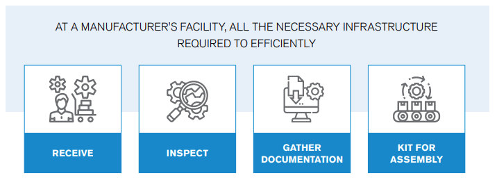 At a manufacturer's facility, all the necessary infrastructure required to efficiently move material through receipt, inspection, documentation gathering and ultimately kitting for assembly will be in place. Fabrication and assembly personnel have ready access to their tools and all necessary equipment required to move/handle materials (cranes, fork trucks, pallet jacks, etc.). The environment in the factory is more closely controlled and meets the requirements of the associated work (i.e. temperature, humidity, fire suppression, etc.).
